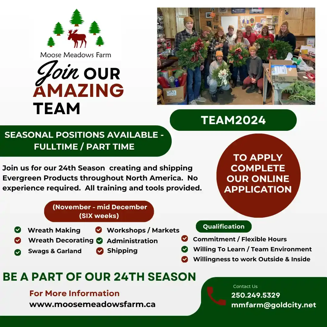 Thank you for interest in joining TEAM2025 for our upcoming Wreath Season! 2025 will be our 24th season creating Fresh & Natural Evergreen Products for sale throughout the Cariboo, British Columbia, Canada and into the US of A! Work spans a timeframe of ~ 6 weeks with the majority of the time spent in our heated workshop at Moose Meadows Farm with good music, good company, good conversation and Tea and Coffee.